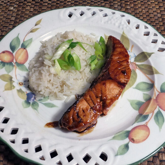 Σολωμός Teriyaki. Tο τεριάκι (κάντσι: 照り焼き) είναι μια μαγειρική τεχνική η οποία χρησιμοποιείται στην Ιαπωνική κουζίνα, όπου τα τρόφιμα ψήνονται στη σχάρα με γλάσο από...