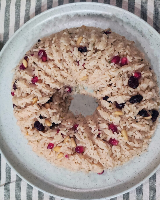 Επίσημο πιλάφι με σταφίδες, κουκουνάρι και ρόδι. Φαγητό χειμωνιάτικο, με πλούσια, πυκνή νοστιμιά.