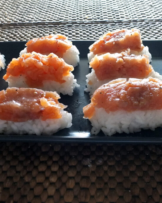 Με το χέρι πλάθουμε μακρόστενα “τουβλάκια” και πάνω από κάθε “τουβλάκι” τοποθετούμε ένα κομμάτι Σολομού. Τα Νιγκίρι μας είναι έτοιμα!