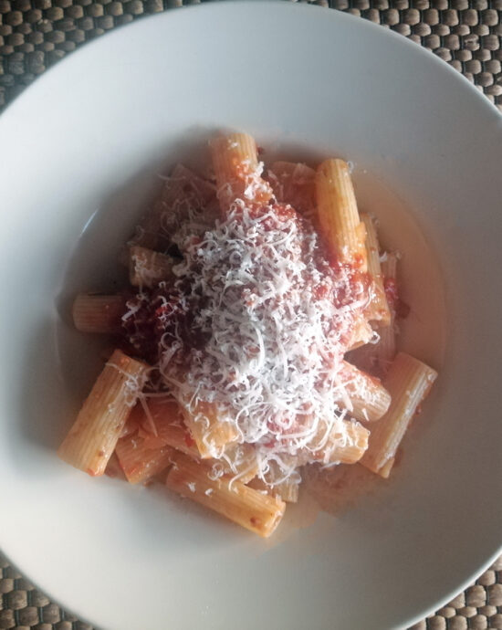Βράζεις τα επιθυμητά ζυμαρικά και όταν έτοιμα, στο σούρωμα κρατάς ελάχιστο νερό τους για την σάλτσα. Τα επιστρέφεις σουρωμένα στην κατσαρόλα, τα βουτηρώνεις και προσθέτεις λίγο απο την σάλτσα ντομάτας. Ανακατεύεις έτσι ώστε να πάρουν χρώμα και σερβίρεις σε βαθύ πιάτο. Προσθέτεις φρεσκοτριμμένη παρμεζάνα και αν έχεις φρέσκο φύλλο βασιλικού.