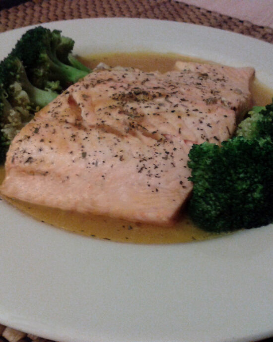 Κουρασμένος γυρνάς απόγευμα στο σπίτι. Από το σουπερμάρκετ αγοράζεις φιλέτο σολoμού και ένα μπουκάλι λευκό κρασί. Στίβεις πορτοκάλι και τα βάζεις στο τηγάνι και μέχρι να αλλάξεις ρούχα, είναι έτοιμος.