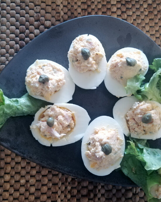 Γεμίζεις με το μείγμα τις κοιλότητες των ασπραδιών, σχηματίζοντας βουναλάκι με κουταλάκι. Γαρνίρεις με ολόκληρη κάππαρη και μαϊντανό.